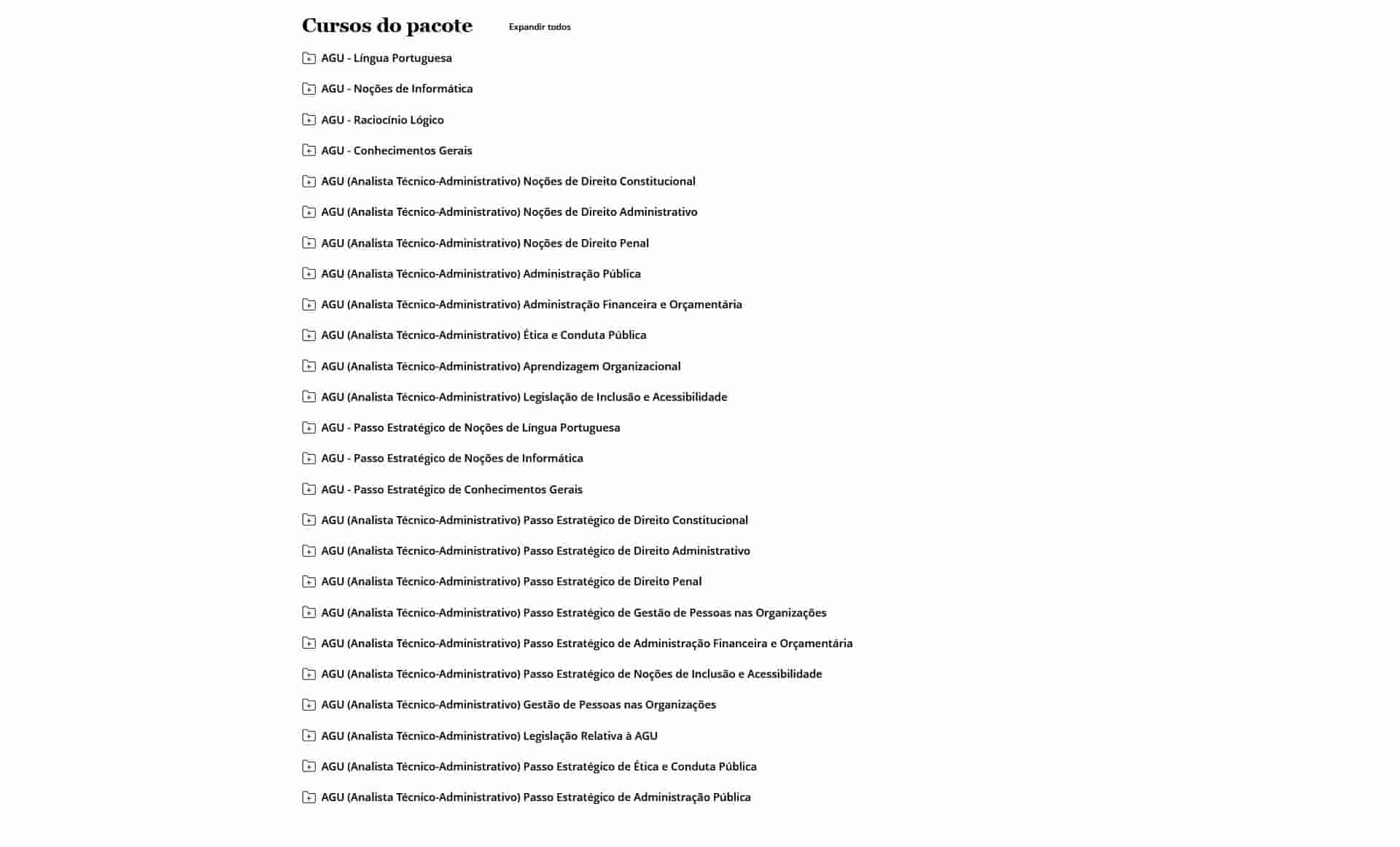 O curso é completo? Sim. O Rateio AGU – Analista Técnico Administrativo (2026) – ESTRATÉGIA inclui todas as disciplinas exigidas, além de bônus exclusivos de simulados.