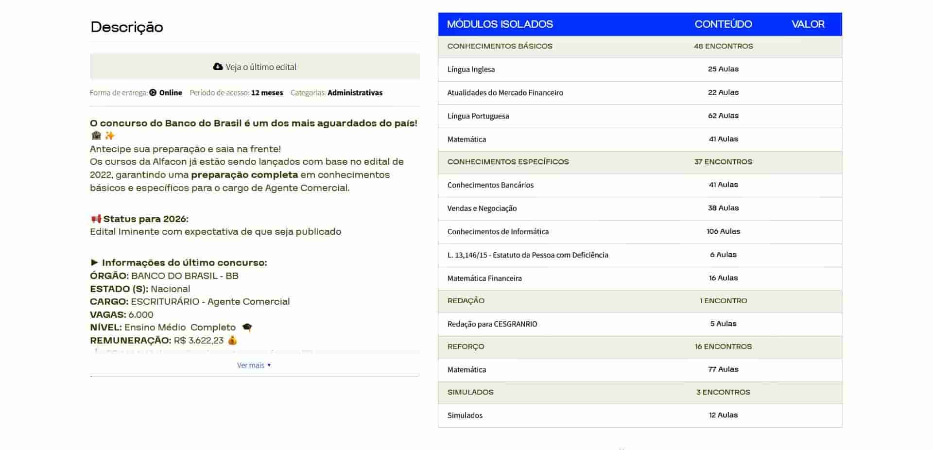 O curso é completo? Sim. O Rateio BB – Escriturário Agente Comercial do Banco do Brasil (2026) – ALFACON inclui todas as disciplinas exigidas, além de bônus exclusivos de simulados.