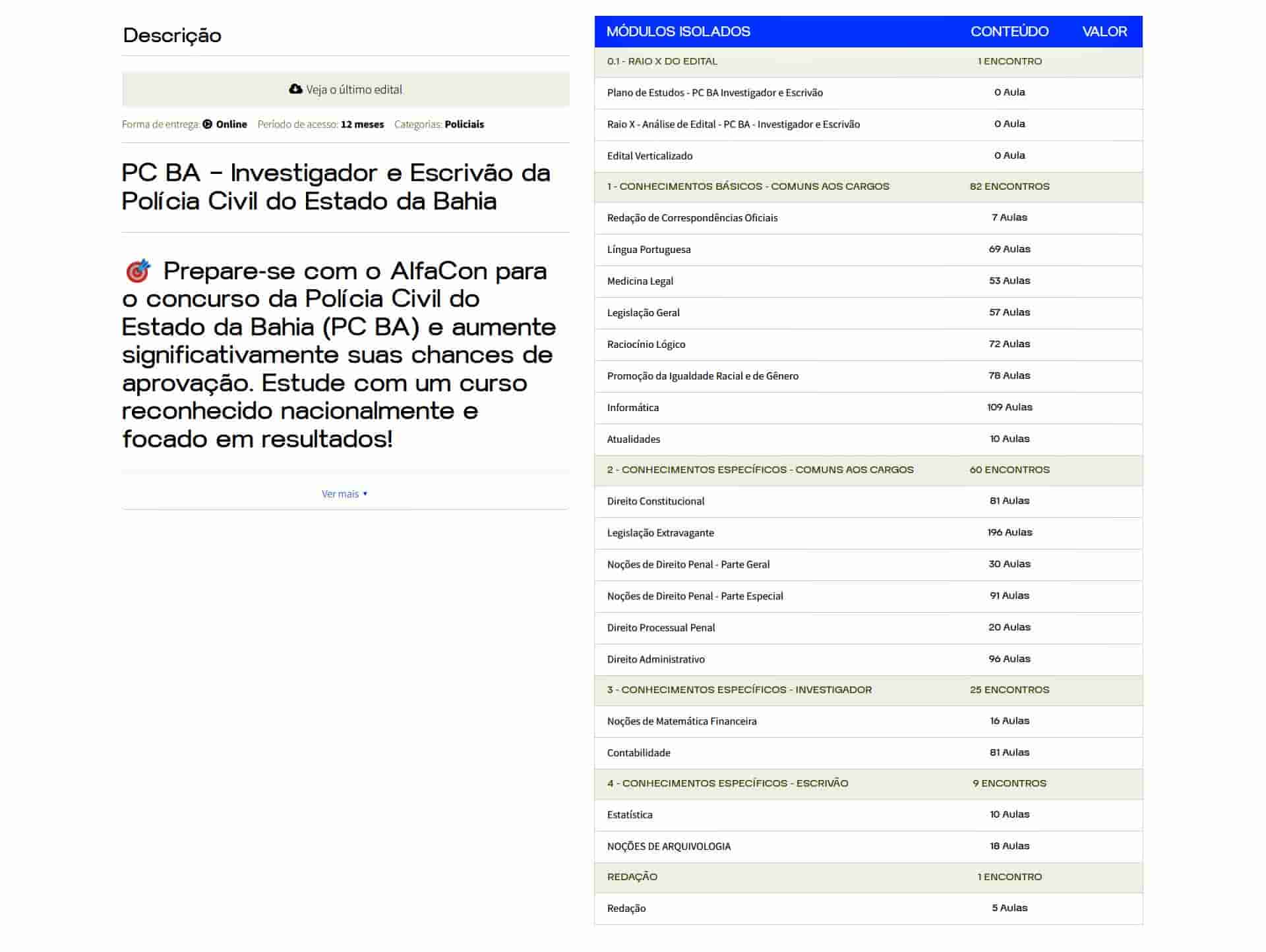 O curso é completo? Sim. O Rateio PC BA – Investigador e Escrivão (2026) – ALFACON inclui todas as disciplinas exigidas, além de bônus exclusivos de simulados.
