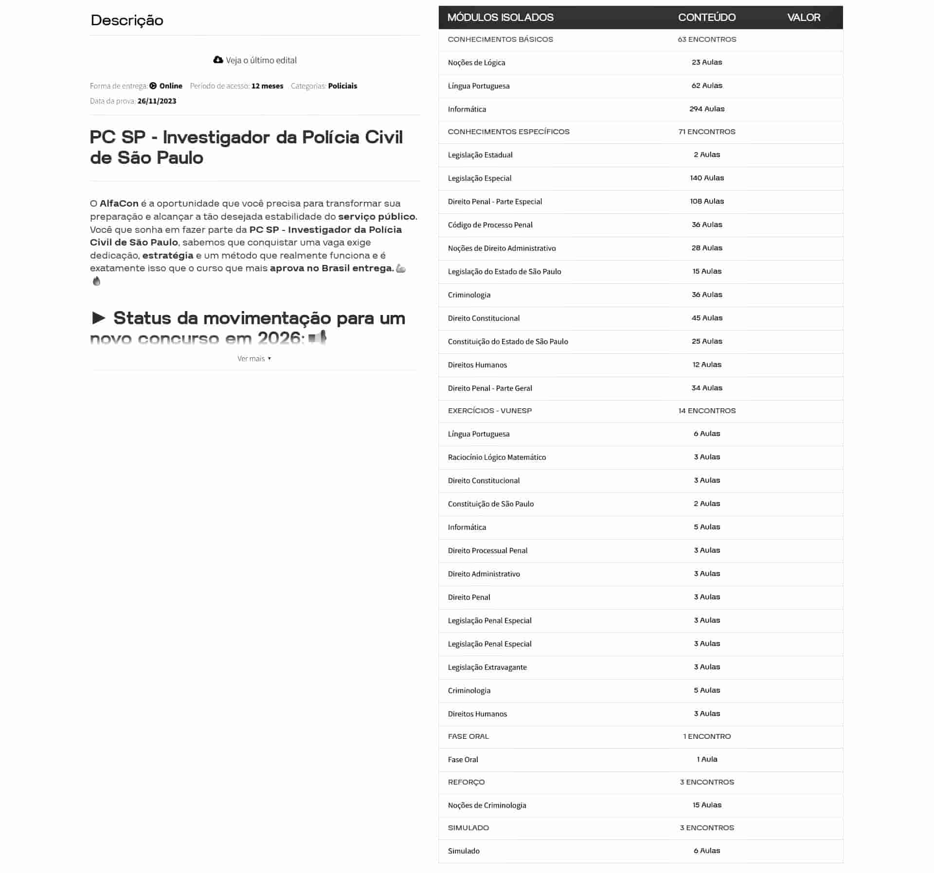 O curso é completo? Sim. O Rateio PC SP – Investigador (2026) – ALFACON inclui todas as disciplinas exigidas, além de bônus exclusivos de simulados.