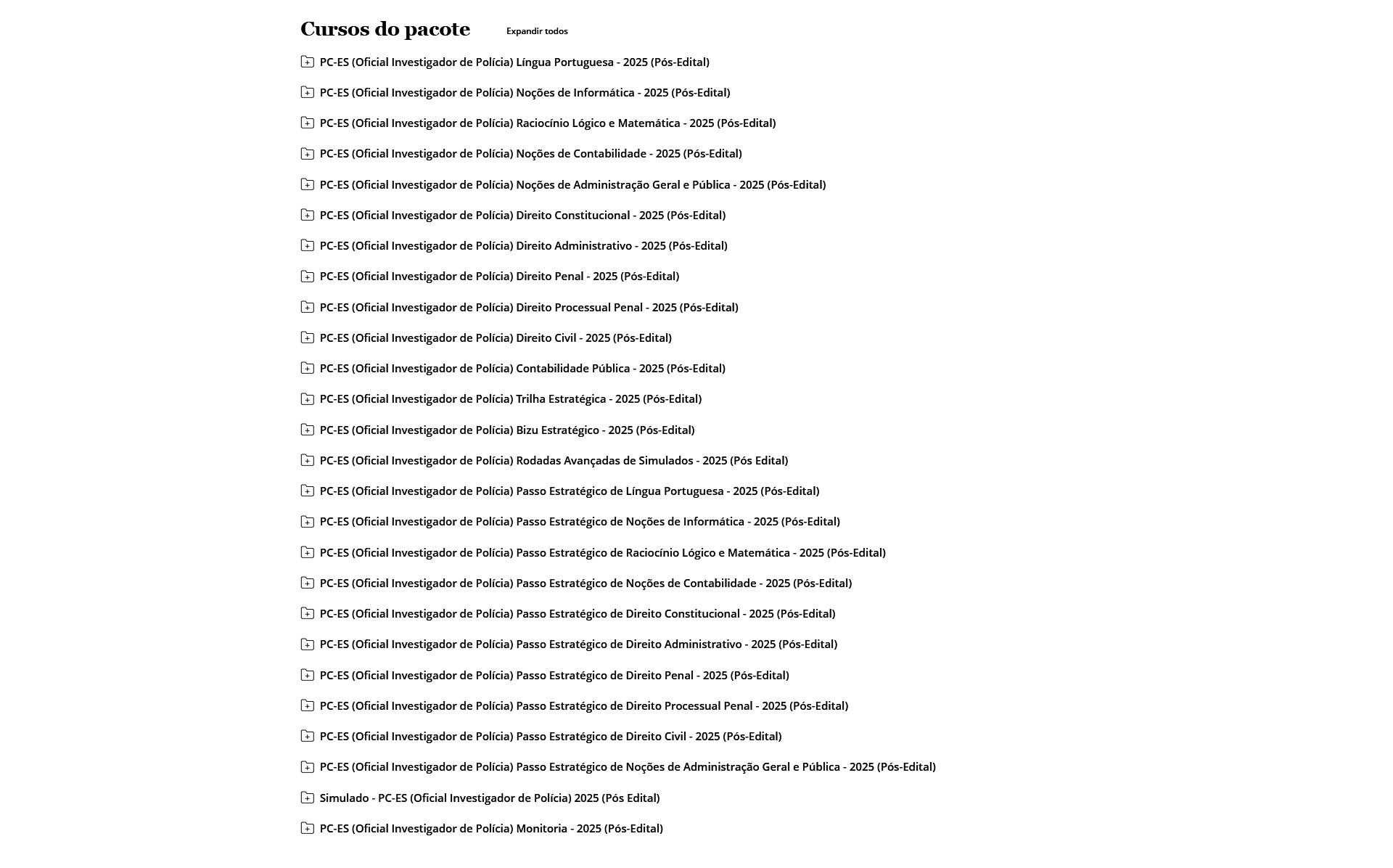 O curso é completo? Sim. O Rateio PC ES – Oficial Investigador de Polícia (2026) – ESTRATÉGIA inclui todas as disciplinas exigidas, além de bônus exclusivos de simulados.
