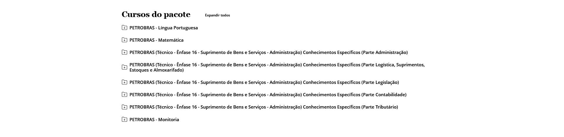 O curso é completo? Sim. O Rateio PETROBRAS – Técnico – Ênfase 16 – Suprimento de Bens e Serviços – Adm (2026) – ESTRATÉGIA inclui todas as disciplinas exigidas, além de bônus exclusivos de simulados.