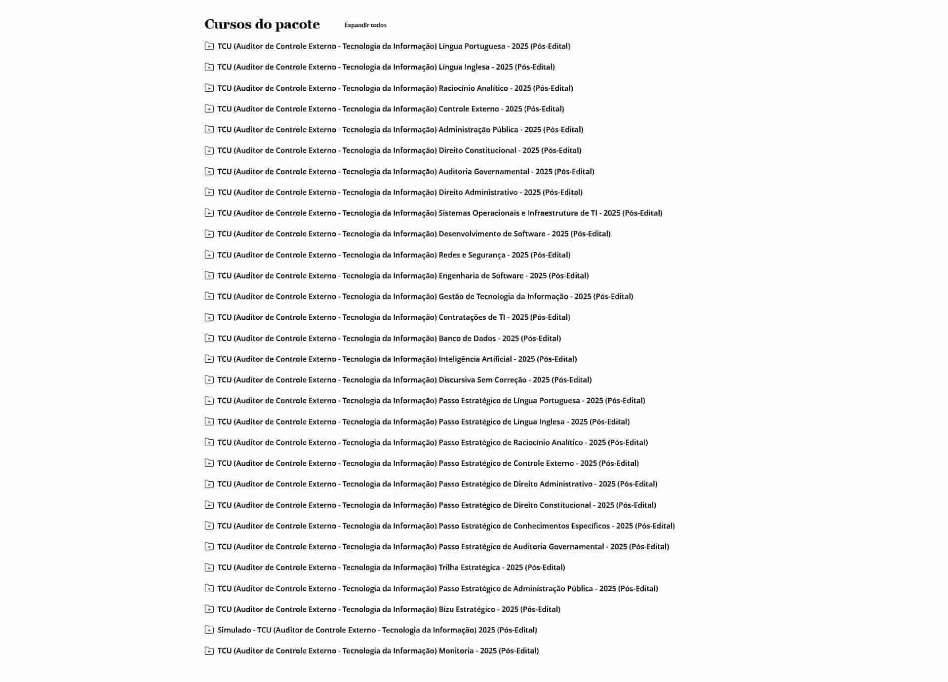 O curso é completo? Sim. O Rateio TCU – Auditor de Controle Externo – Tecnologia da Informação (2026) – ESTRATÉGIA inclui todas as disciplinas exigidas, além de bônus exclusivos de simulados.