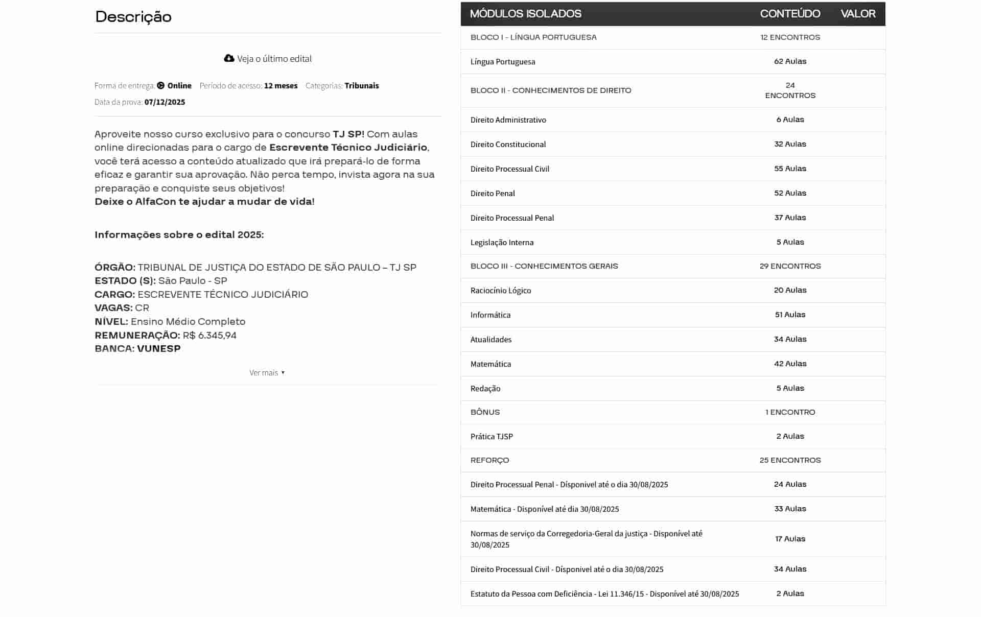 O curso é completo? Sim. O Rateio TJ SP – Escrevente Técnico Judiciário (2026) – ALFACON inclui todas as disciplinas exigidas, além de bônus exclusivos de simulados.